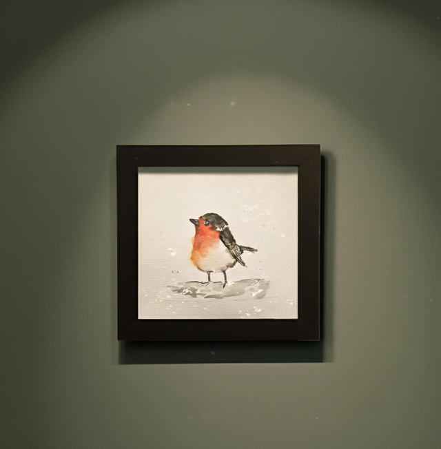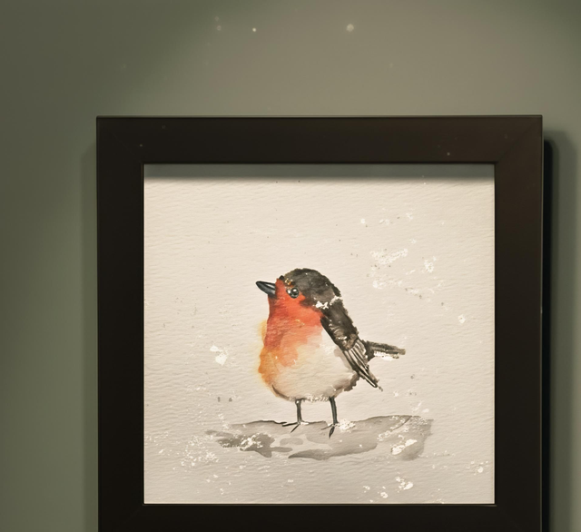 Elevate your space with this charming 4x4 inch watercolour artwork by artist Maria Smith, featuring an endearing baby robin. It's delicately gilded with genuine silver or gold leaf (use the correct metal here) to catch the light, mimicking the gentle fall of snow.