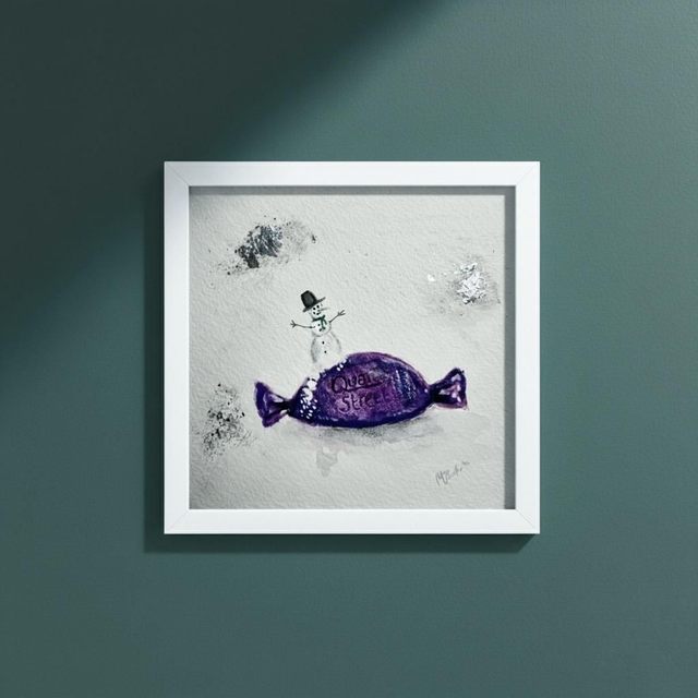 of childhood Christmas. It captures the simple, perfect joy of finding the "Big One" in the festive tin, paired only with the quiet thrill of new-fallen snow. The miniature snowman stands proudly on his purple throne—a symbol of the cosy winter afternoon spent building, dreaming, and savouring that chocolate treasure. It’s pure nostalgia for the taste of chocolate and the cold magic of a snow day with loved ones.