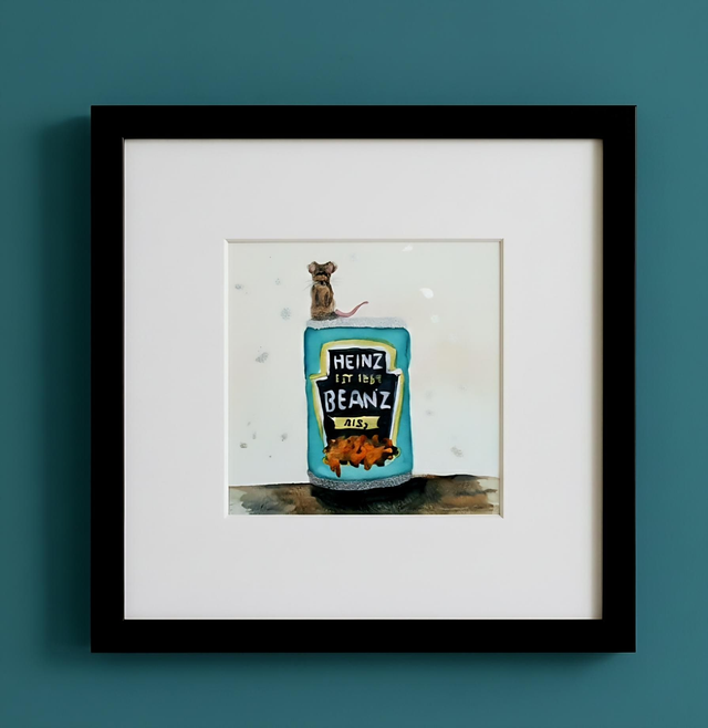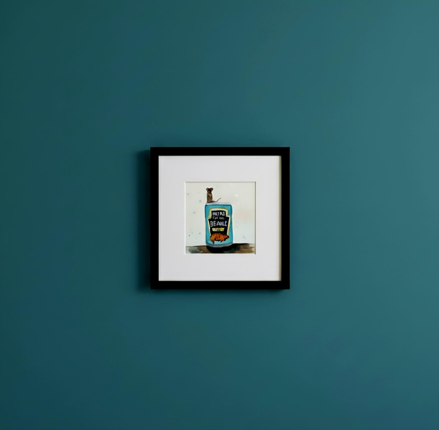 The original painting is the artist's smallest yet, featuring a 2x2 inch painting that is beautifully accented with shimmering silver glitter and paint for a touch of mischievous sparkle. This unique piece is professionally framed and protected by high-quality Perspex.