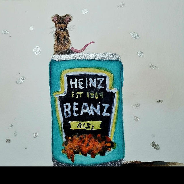 Min the mouse dreamed of the kitchen cupboard. One night, the door was ajar! He scampered inside and found a gigantic, turquoise Heinz Beanz can, shimmering with silver. He climbed to the top, feeling like a king. Below him, a spill of delicious orange beans waited. "Oh, it's bean fun!" He squeaked, ready for his feast.